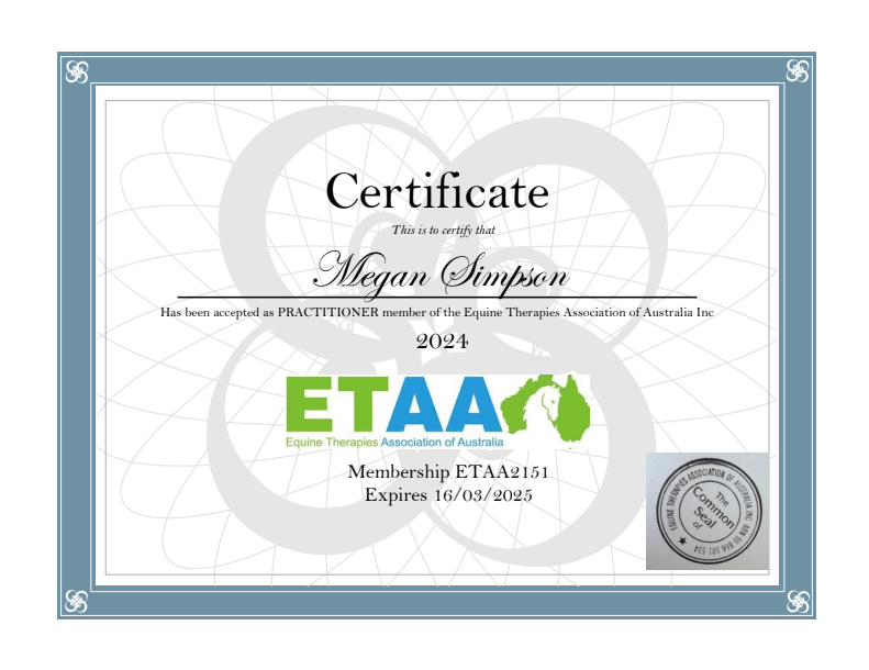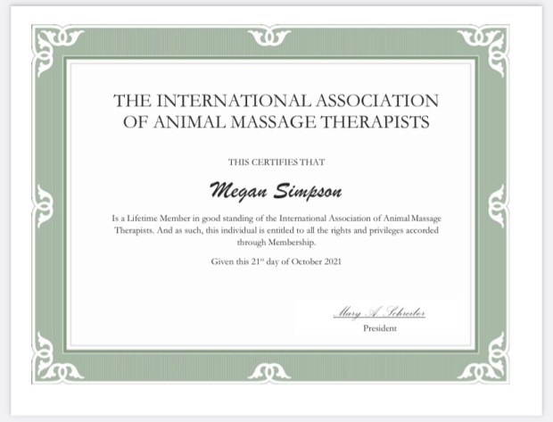 Cert. Equine Sports Massage and Rehabilitation Therapist (ESMT), Dip. Equine Shiatsu, fully insured, and registered with the IAAMT and ETAA